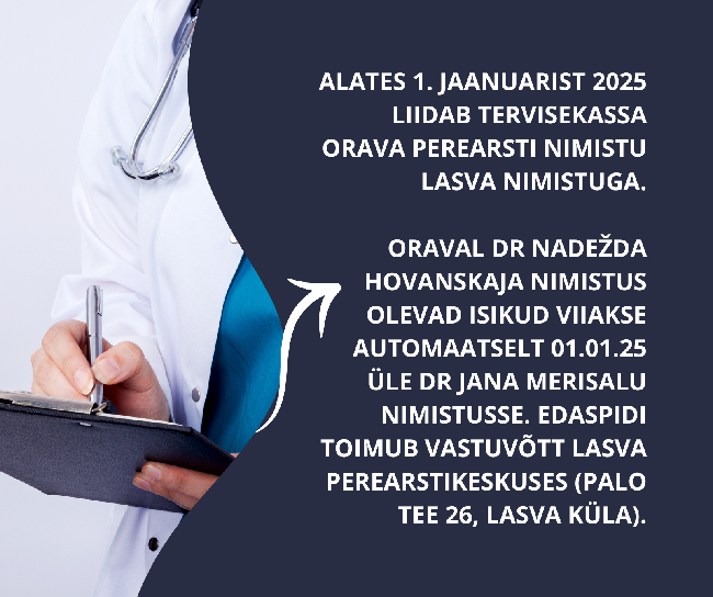 Alates 1. jaanuarist 2025 liidab Tervisekassa Orava nimistu Lasva nimistuga. Sellega seoses dr Nadežda Hovanskaja ei jätka nimistu N0581 perearstina. Antud nimistu patsientidel on alates 01.01.2025 uus perearst - dr Jana Merisalu nimistuga N0793.