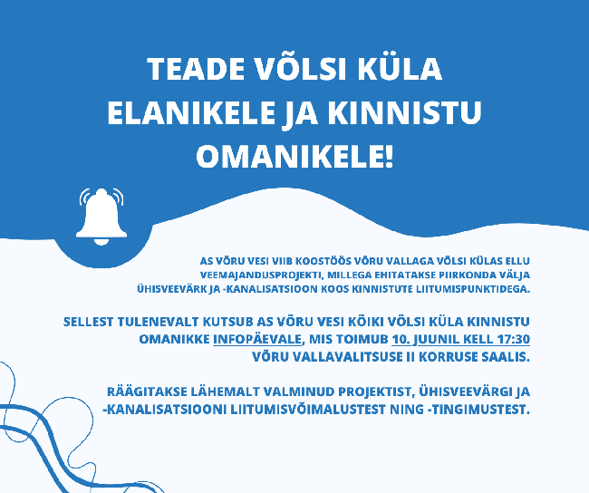 Sellest tulenevalt kutsub AS Võru Vesi kõiki Võlsi küla kinnistu omanikke infopäevale, mis toimub 10. juunil kell 17:30 Võru Vallavalitsuse II korruse saalis.