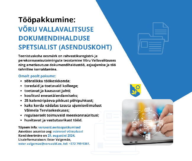Avalik konkurss Võru Vallavalitsuse ajutiselt äraoleva dokumendihalduse spetsialisti asendaja leidmiseks