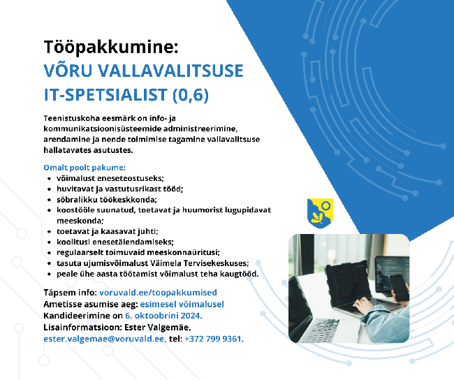 Dokumendid palume esitada digiallkirjastatult 6. oktoobriks 2024 e-posti aadressil vald@voruvald.ee märgusõnaga „IT-spetsialisti konkurss".
