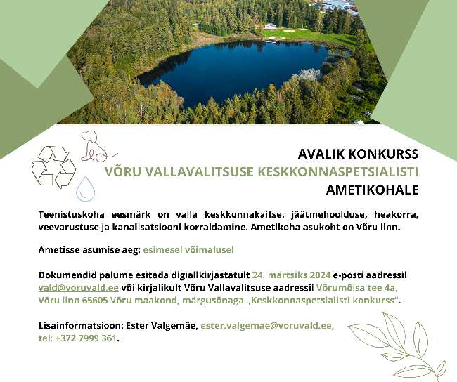 Avalik konkurss Võru Vallavalitsuse keskkonnaspetsialisti leidmiseks