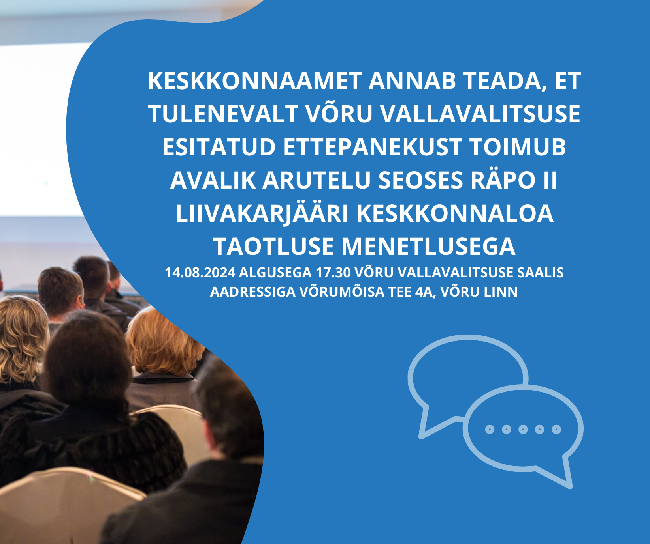 Keskkonnaamet annab teada, et tulenevalt Võru Vallavalitsuse esitatud ettepanekust toimub avalik arutelu seoses Räpo II liivakarjääri keskkonnaloa taotluse menetlusega.