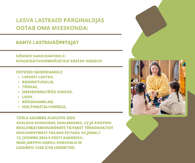 Lasva Lasteaed Pargihaldjas ootab oma kollektiivi põhikohaga kahte lasteaiaõpetajat
