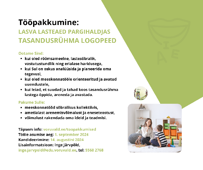 Lasva Lasteaed Pargihaldjas võtab tasandusrühma tööle logopeedi (1,0 koormus, 2024/2025 õppeaastaks).