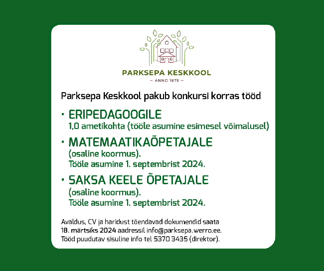 Parksepa Keskkool pakub konkursi korras tööd eripedagoogile, matemaatikaõpetajale ja saksa keele õpetajale
