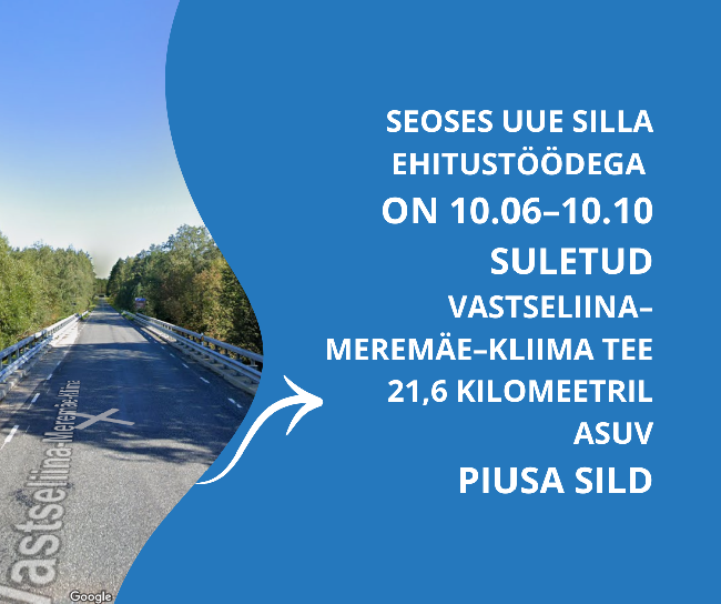 Alates 10. juunist on seoses uue silla ehitustöödega ajutiselt suletud Vastseliina–Meremäe–Kliima tee 21,6 km asuv Piusa sild.