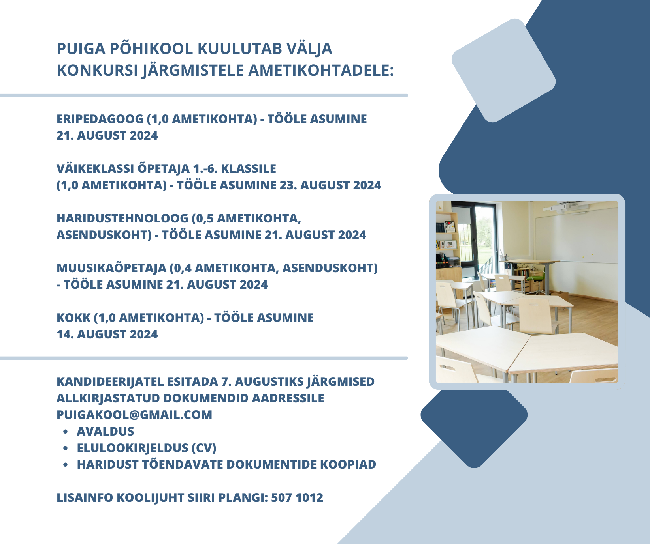 Puiga Põhikool kuulutab välja konkursi järgmistele ametikohtadele: