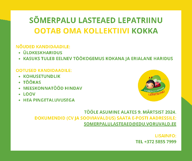 Sõmerpalu Lasteaed Lepatriinu ootab oma meeskonda kokka