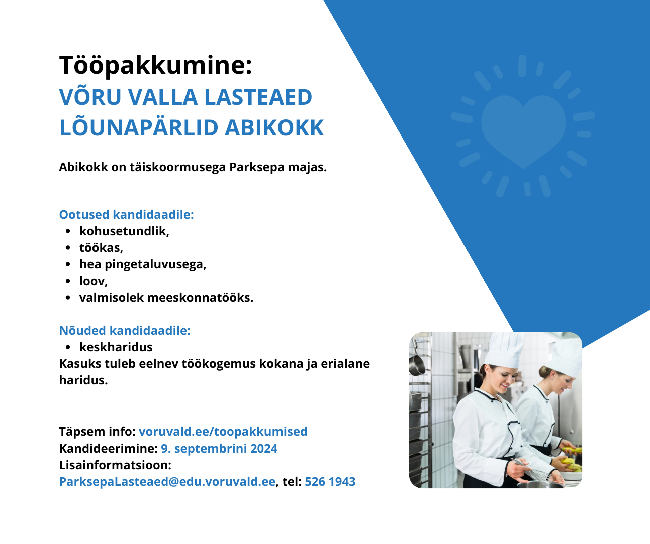 Võru valla lasteaed Lõunapärlid ootab oma meeskonda abikokka.