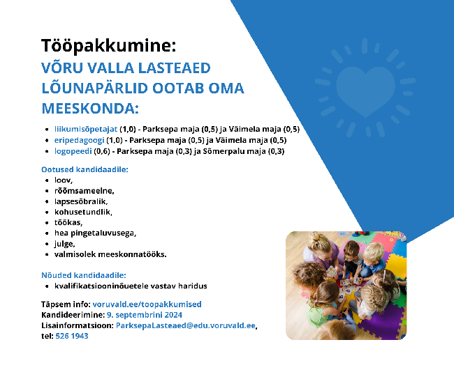 Võru valla lasteaed Lõunapärlid ootab oma meeskonda liikumisõpetajat, eripedagoogi ja logopeedi