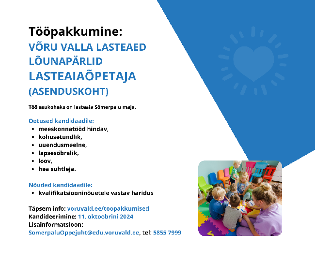 Võru valla lasteaed Lõunapärlid ootab oma toredasse meeskonda alates novembrist tööle lasteaiaõpetajat (asenduskoht).