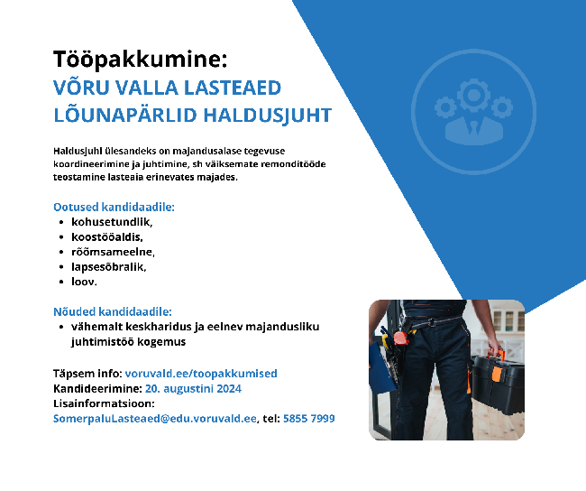 Võru valla lasteaed Lõunapärlid ootab oma toredasse meeskonda alates septembrist 2024 tööle haldusjuhti (1,0 koormus).