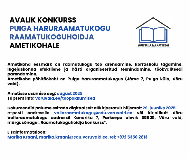 Tule ja loo koos meiega väärtust kogukonnale! Otsime oma meeskonda pühendunud ja teotahtelist raamatukoguhoidjat, kelle põhitöökoht asub Puiga haruraamatukogus (Järve 7, Puiga küla, Võru vald).