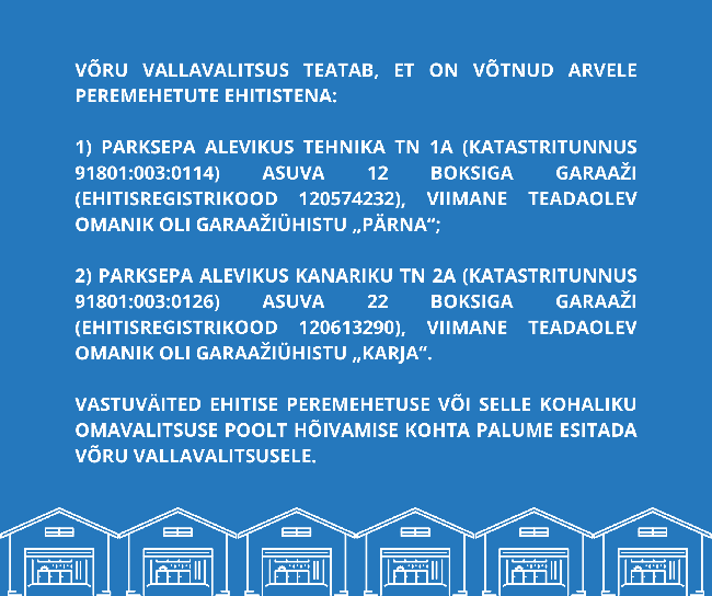 Võru Vallavalitsus teatab, et on võtnud Võru vallas arvele peremehetute ehitistena kaks garaaži