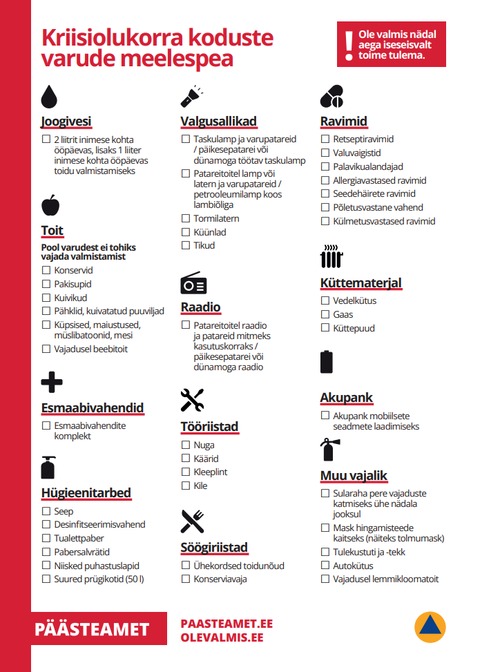 - Ole teadlik, millised kriisiolukorrad võivad teid ohustada, mis on nende mõju pere igapäevaelule ning kuidas nendeks ühiselt valmistuda.