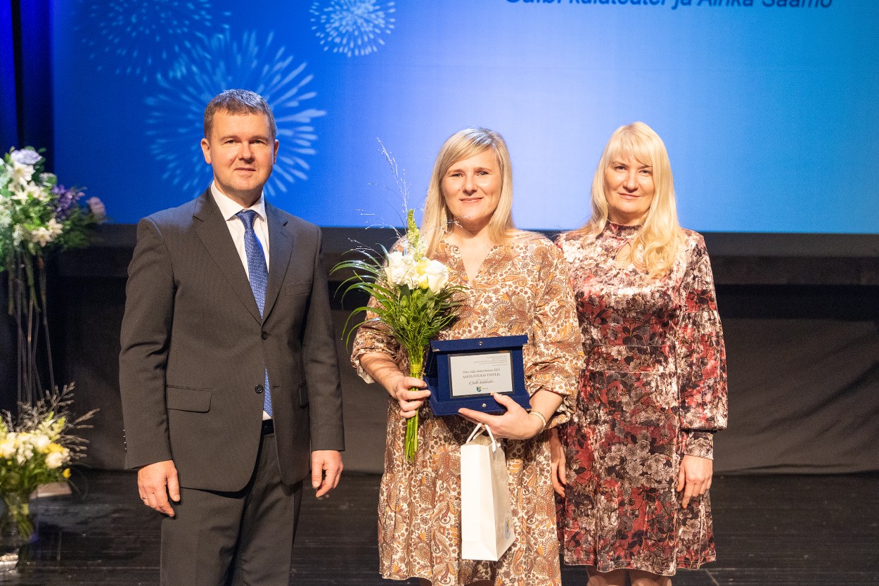 Võru vallavanem Kalmer Puusepp, aasta eduka esineja Sulbi külateatri esindaja Airika Saamo ja Võru valla abivallavanem Piret Otsatalu. Foto: Mariliis Kivimäe