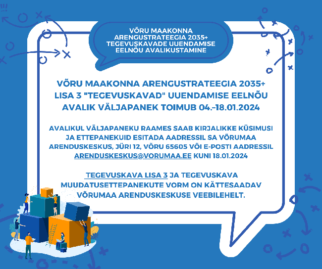 Võru maakonna arengustrateegia 2035+ Lisa 3 "Tegevuskavad" uuendamise eelnõu avalik väljapanek toimub 04.–18.01.2024.