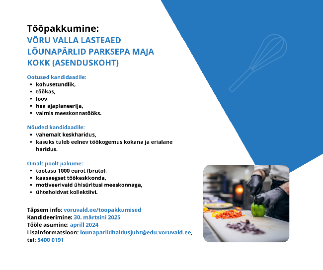 Võru valla lasteaed Lõunapärlid Parksepa maja otsib kokka (asenduskoht).